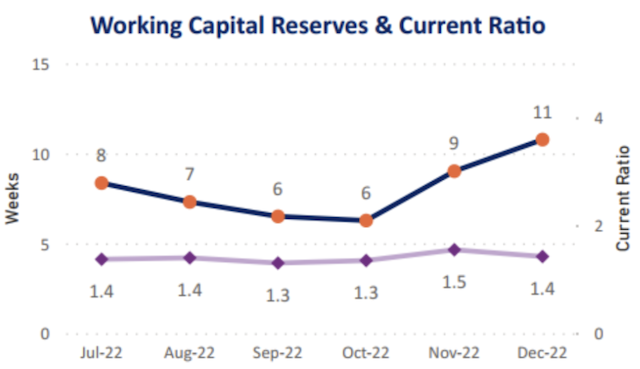 In the graph pictured, December was a strong surplus month. This had a positive impact on the working capital in weeks, moving that ratio up. All other things being equal, the current ratio (current assets / current liabilities) should also move positively, however…